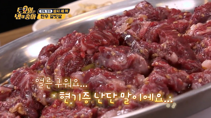 사장님 피셜 - 소금구이는 된장소스에 찍어 먹을 것을 추천, 양념갈비는 고추장 소스를 추천한다고 합니다. 평소에 먹던 갈빗살보다 훨씬 부드럽다는 히밥님. 숙성을 했다는데도 고기가 신선한 게 보이네요. 된장소스에 찍어 먹으면 만세를 하게 됩니다. ㅎㅎㅎ 매콤 달콤한 파무침이 아주 맛있어요!