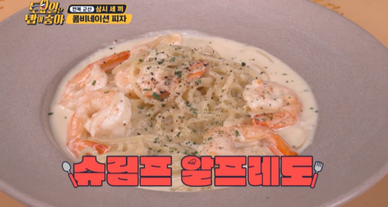 마늘이 들어간 알프레도는 크림이 들어갔지만 그렇게 느끼하지 않아요. 그거 아세요? 피자에 스파게티 올려먹으면 존맛탱인거? 다들 해보시길 추천합니다.