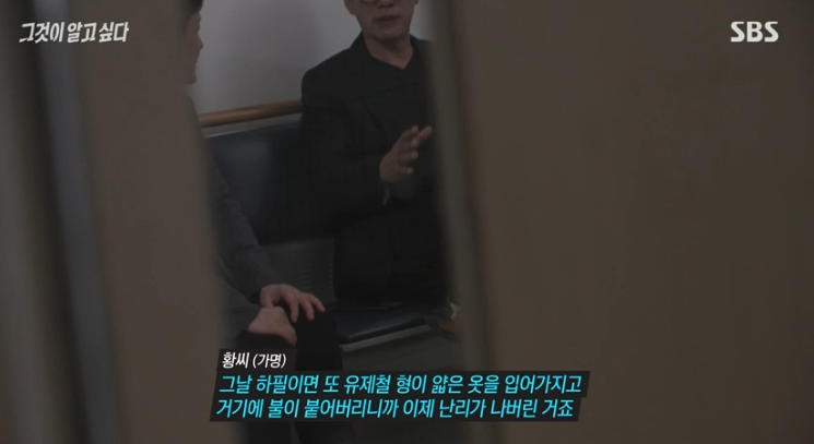 그날 실수로 불을 냈다고 하는 황 씨. 황 씨는 유 씨가 불에 붙으니까, 불을 끄는 상황에서 자기 손도 많이 데었다는 사진을 유 씨 가족들에게 보여주게 된다.