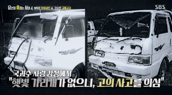 오른쪽으로 꺾어야 하는데 남편은 왼쪽으로 꺾어서 간판을 들이받고 그대로 저수지에 빠졌다? 아내는 당시 보험을 9개 들어놓은 상태였고 보험금만 9억 3천만 원이었다.