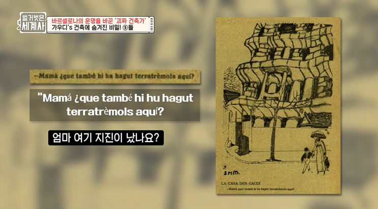 Q. 이것은 카사 밀라가 완공된 후, 그려진 만평입니다. 이 만평에서 카사 밀라를 본 어린이가 엄마에게 한 말을 무엇일까요? 엄마 여기 지진이 났나요?