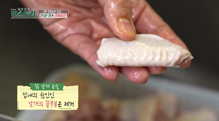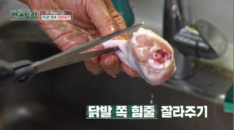 잡내의 원인인 날개의 끝부분은 제거해 줍니다. 닭을 튀길 때는 엉덩이 쪽 지방은 그대로 둡니다. 닭발 쪽 힘줄을 잘라주면 모양도 이쁘고 먹기도 편합니다.