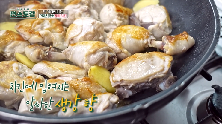 편으로 썬 생강 한 톨로 향도 갈리고 잡내도 잡아줍니다. 치킨에 입혀지는 알싸한 생강 향!