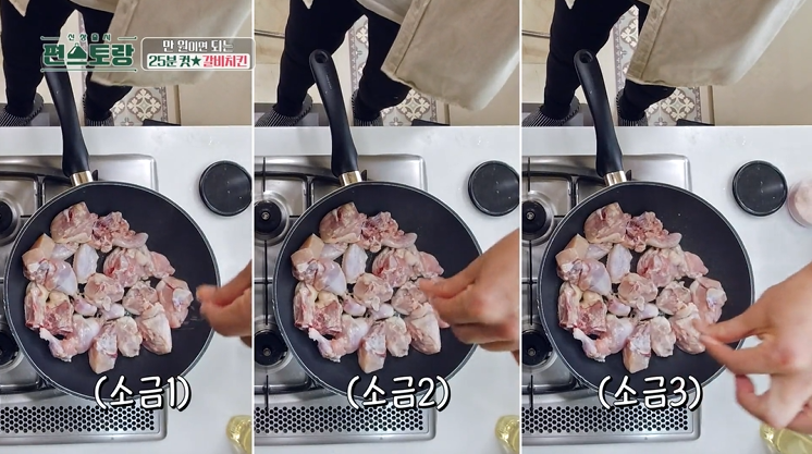 소금을 3꼬집 넣어줍니다. 닭의 한 면을 3분 정도 구워줍니다.
