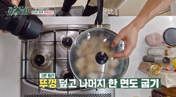 중불로 줄이고 닭을 뒤집어 줍니다. 3분 동안 뚜껑 덮고 나머지 한 면도 구워줍니다.