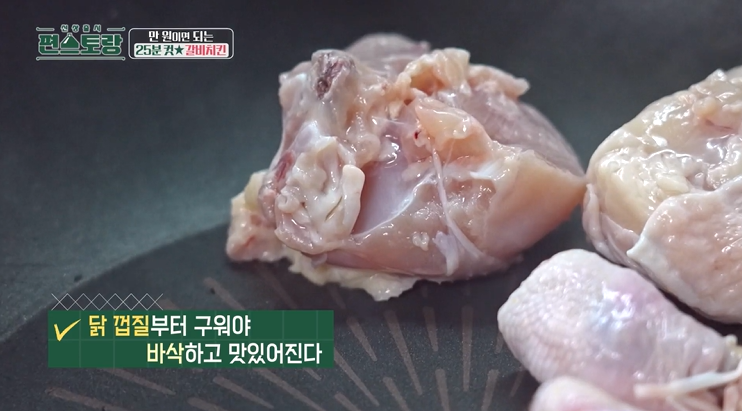 프라이팬 전체에 충분히 예열 후 닭의 껍질이 아래로 가게 올려줍니다. 닭 껍질부터 구워야 바삭하고 맛있어집니다.